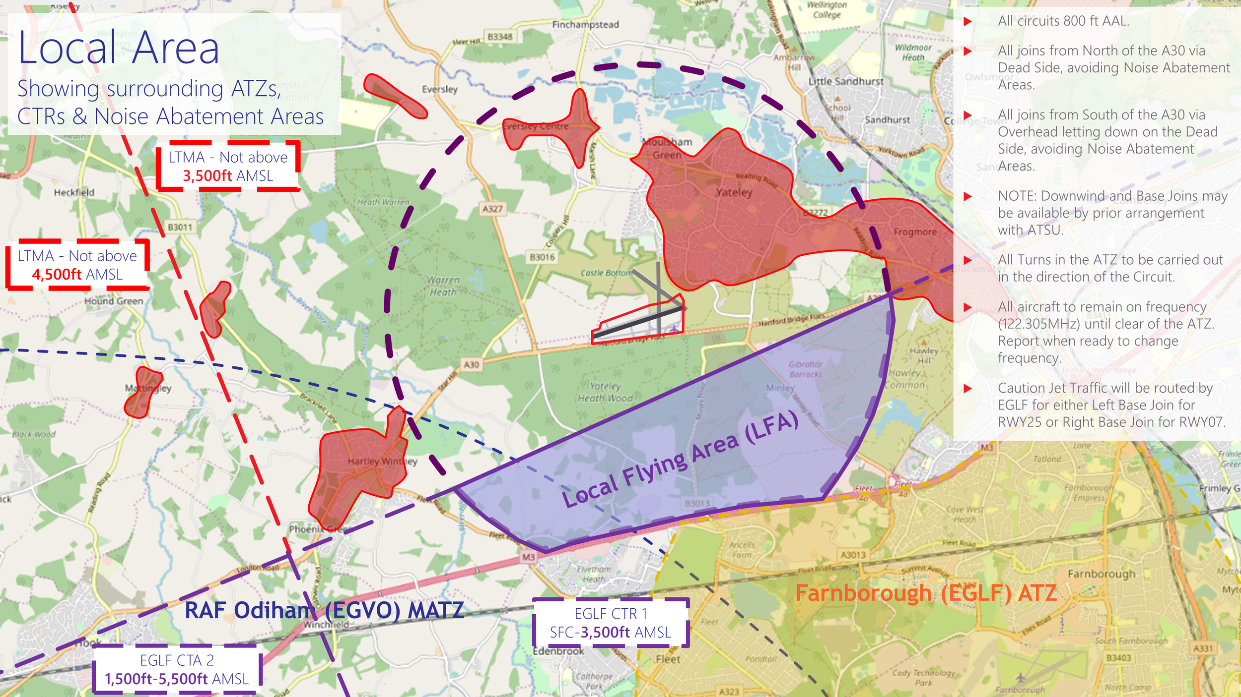 Pilots must remain north of the M3 motorway to avoid infringing the Farnborough ATZ/CTR.