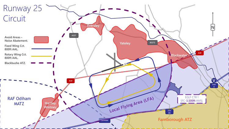 Unless in an emergency, all turns must be to the south. To leave the circuit, climb on the downwind leg into the overhead, remaining outside controlled airspace by remaining below 2,000 feet AMSL (1,675 feet AGL) unless in receipt of a clearance from Farnborough Radar.”