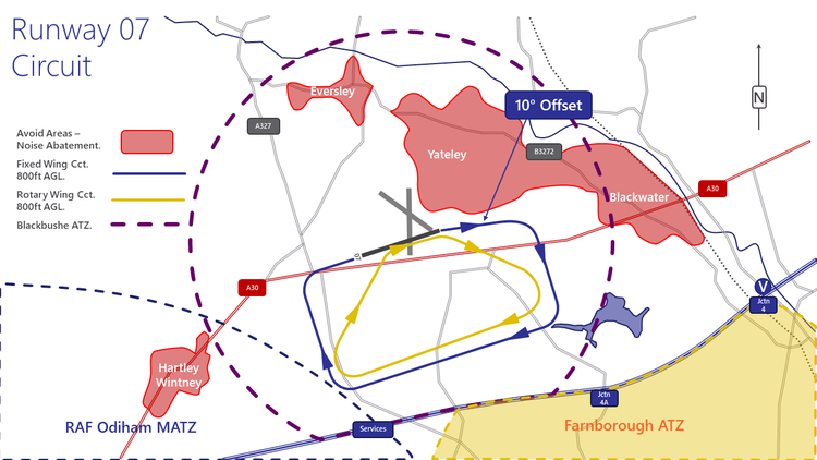 When joining for Runway 07 turn base leg When joining or descending deadside, take care to remain west of Yateley. Follow the path of disused runway 14/32, keeping it to the left at all times.